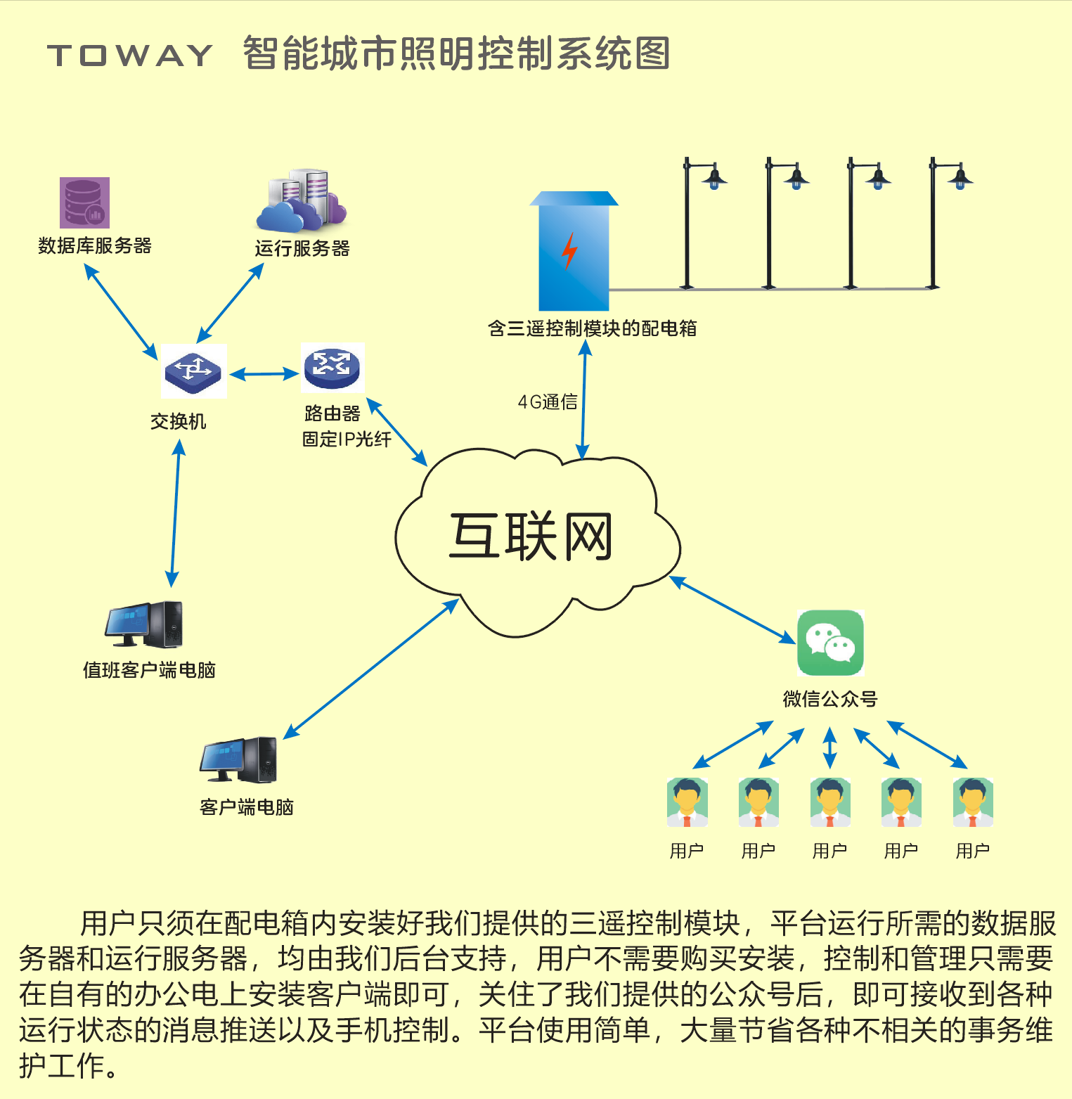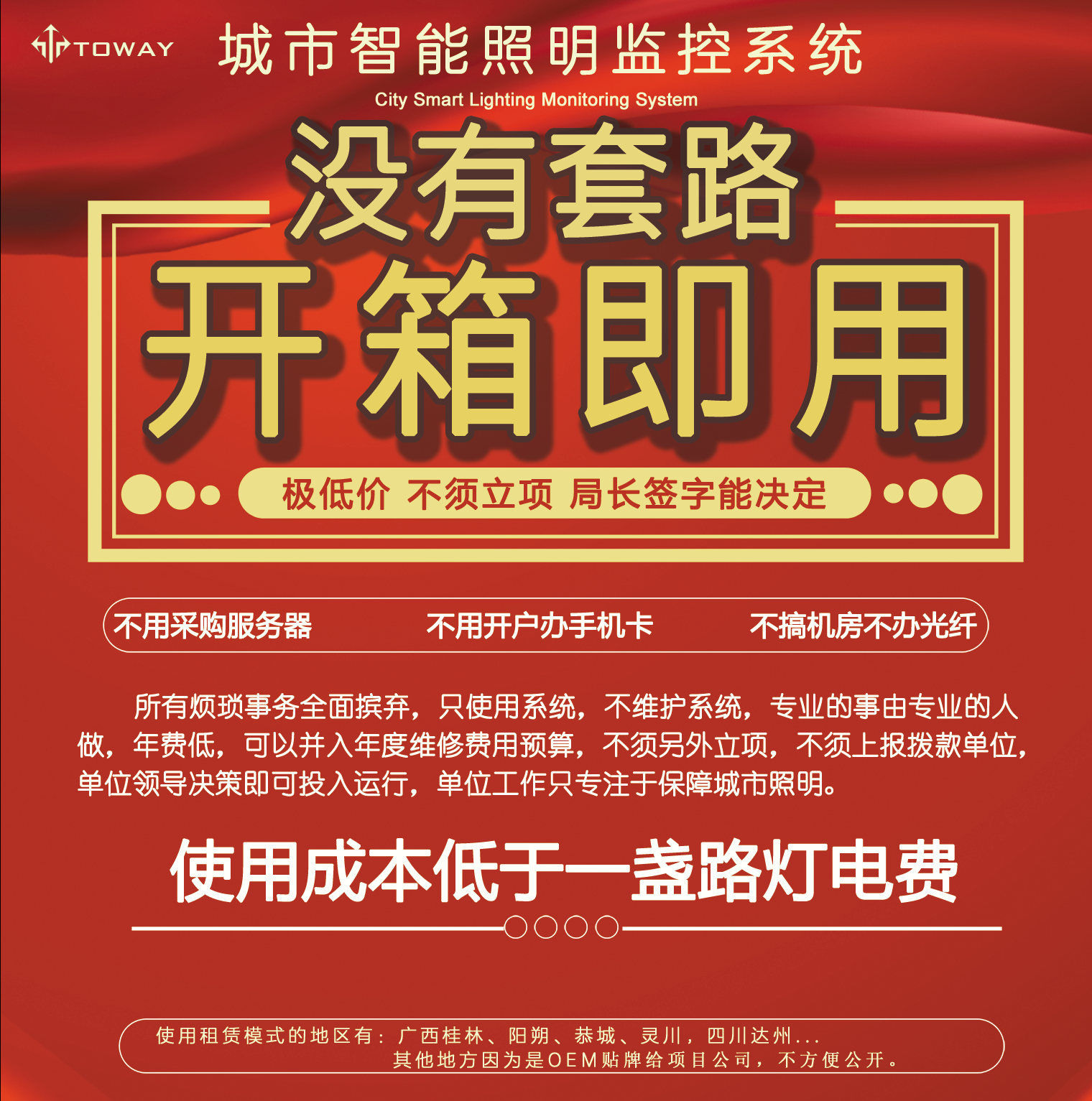 此方案對于一個縣城100臺路燈配電箱的體量,首年開支也只有三萬五千元,此后每年費用是兩萬五,本方案最大的優(yōu)點就是費用低廉,這筆費用完全可以并入年度維護撥款中核銷。且不會有設(shè)備過保要重新采購的問題出現(xiàn)。